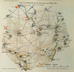 Der neue Oberbefehlshaber der Verbündeten General Graf Wittgenstein erteilte genau 12:00 Uhr Mittags dem General Blücher den Angriffsbefehl mit den Worten: »Mit Gottes Hilfe vorwärts!« 30 Geschütze der preußischen Artillerie eröffneten die Schlacht mit einem Feuerüberfall auf das Biwak der Franzosen in Großgörschen.