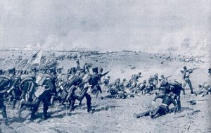 Ca. 45 Minuten nach Beginn des Artillerieüberfalls traten die preußischen Bataillone unter Oberst Klüx in breiter Front zum Sturmangriff an. Schlesische Schützenbataillone und das freiwillige Jägerdetachement des preußischen Adels nahmen im ersten Schwung den strategisch wichtigen Hohlweg südlich von Großgörschen unweit des heutigen Monarchenhügels. Die französischen Verteidiger wurden auf Großgörschen zurückgedrängt. Die nachfolgenden westpreußischen Regimenter stießen durch die entstandene Lücke, drangen bis zum Dorfrand vor, konnten hier mehrere Geschütze erbeuten und Gefangene machen. Dann begann der Kampf Mann gegen Mann. Die Franzosen verteidigten sich sehr tapfer und wehrten jedes weitere Eindringen der Preußen in das Dorf erbittert ab. Bald stand Großgörschen in Flammen. Die Ordnung der zuerst angreifenden Bataillone löste sich schnell auf. Die Brigade des Oberst Klüx kam nicht mehr weiter. Nun wurde den Verbündeten klar, die Truppen welche ihnen gegenüberstanden waren nicht nur eine Flankendeckung der marschierenden Truppen, sondern ein ganzes französisches Armeekorps.